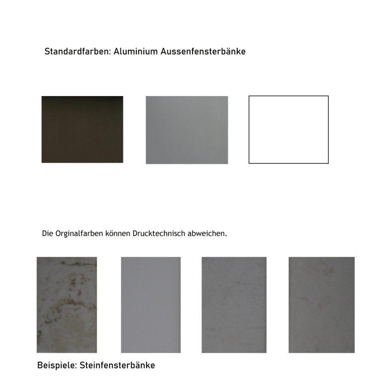 Aussenfensterbänke werden aus stranggepresstem Aluminium hergestellt. Die Oberfläche wird eloxiert oder pulverbeschichtet. Unsere Standardfarben sind Natur eloxiert, weiß RAL 9016, schokobraun RAL 8017 und anthrazitgrau RAL 7016. Viele weitere RAL-Farben sind optional gegen Aufpreis lieferbar.