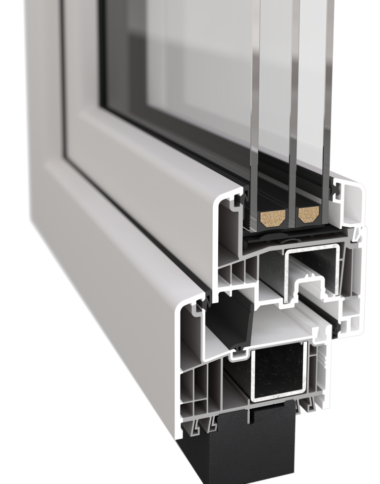 Das Drei-Kammer System mit drei Dichtungsebenen erreicht einen Uw-Wert von bis zu 0,9 W(m²K). Berechnet bei Einsatz einer 3-fach Verglasung Ug= 0,5 W(m²K) mit warmer Kante. eines Fensters in der Größe 1,23 m x 1,48 m.