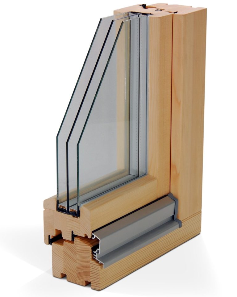 Das Fenstersystem IV90 in verschiedenen Ausführungen aus vierfach verleimten Holzkanteln, bis zu drei Dichtungsebenen erreicht einen Uw-Wert von bis zu 0,82 W(m²K).Berechnet bei Einsatz einer 3-fach Verglasung Ug= 0,5 W(m²K) mit warmer Kante. eines Fensters in der Größe 1,23 m x 1,48 m