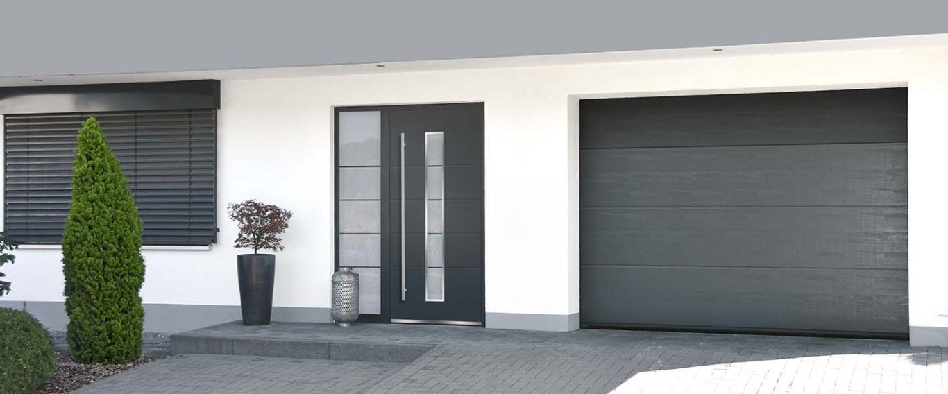 Fenster, Rollladen, Eingangstür und Garagentor im farblichen Einklang.